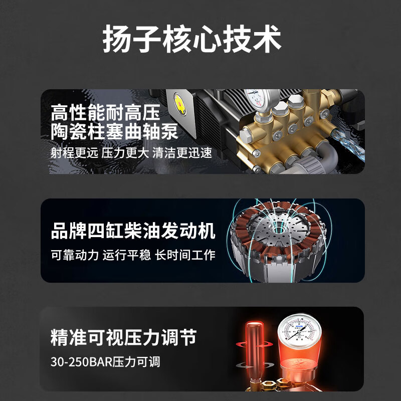 揚(yáng)子下水道疏通機(jī)YZ25-45D/YZ20-70D柴油款 物業(yè)小區(qū)市政高壓沖洗管道,高精準(zhǔn)工業(yè)級AR性能泵高性能耐高壓,精準(zhǔn)可視壓力調(diào)節(jié)實(shí)時操控,30-250BAR壓力可調(diào)。